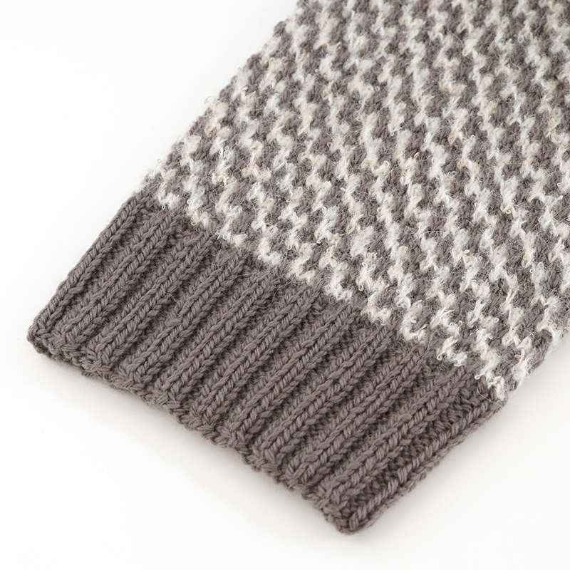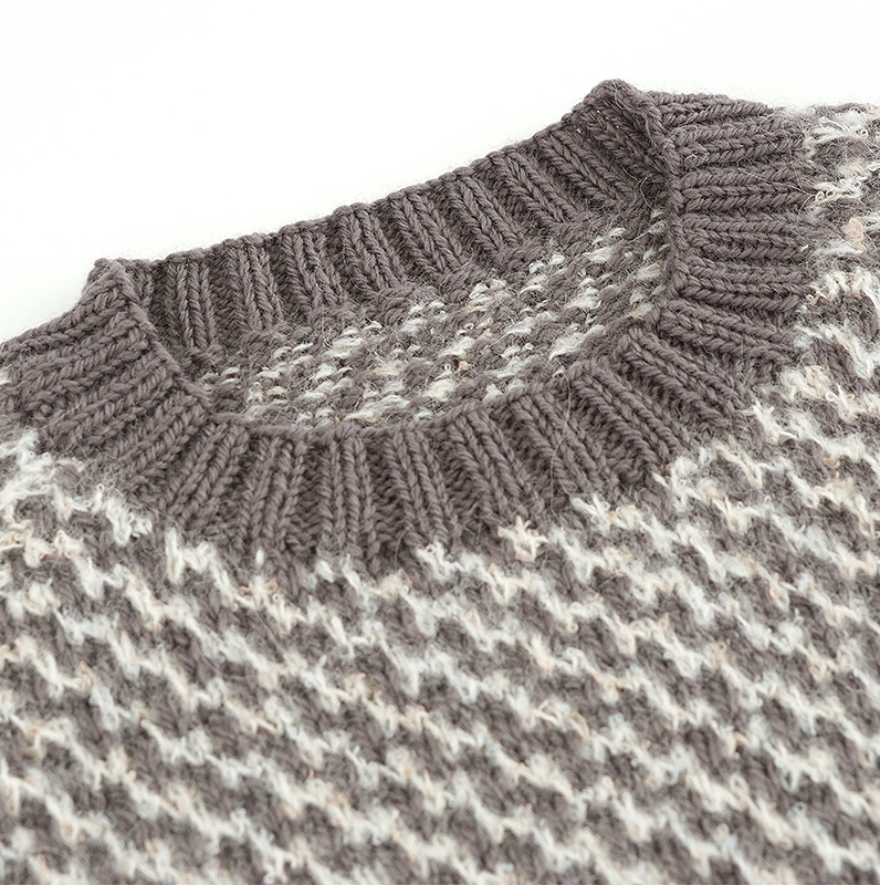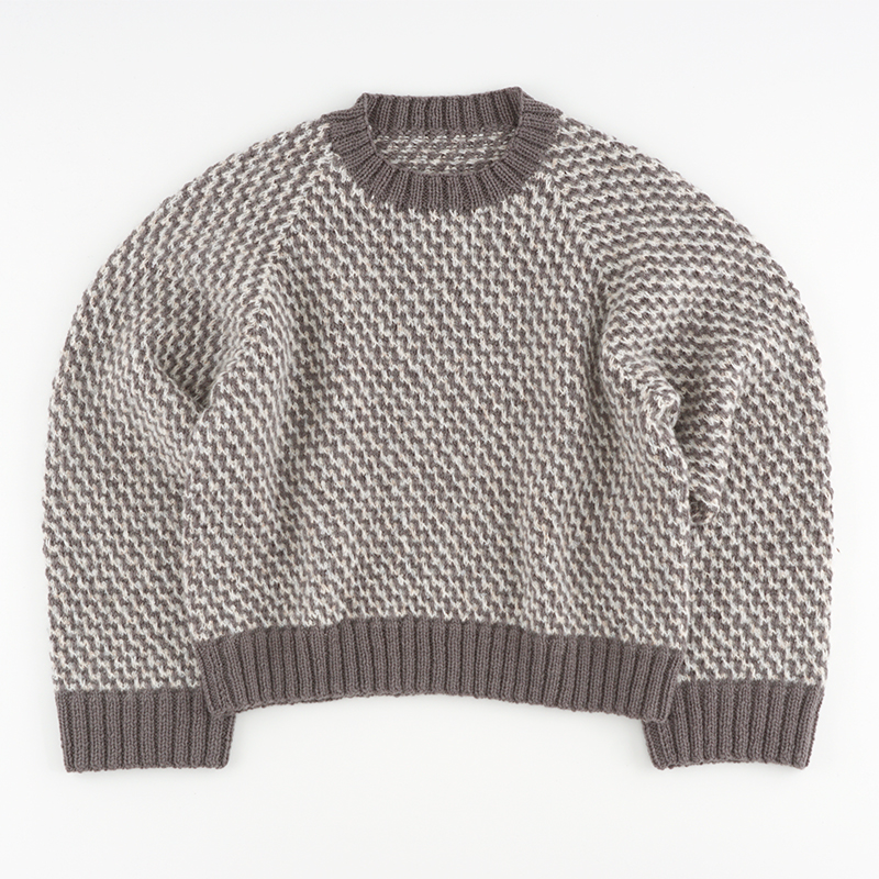 ループ糸とストレートヤーンを組み合わせてジグザグ模様に編みました。ラグラン袖と暗めの色使いでメンズライクな仕上がりが楽しめます。
