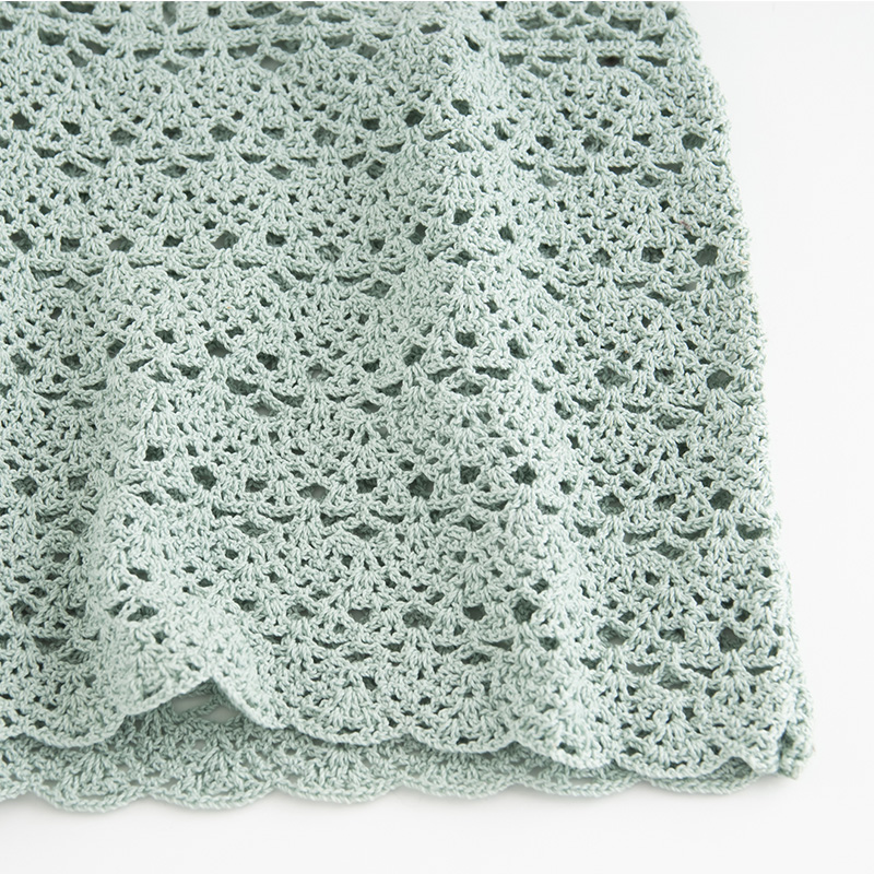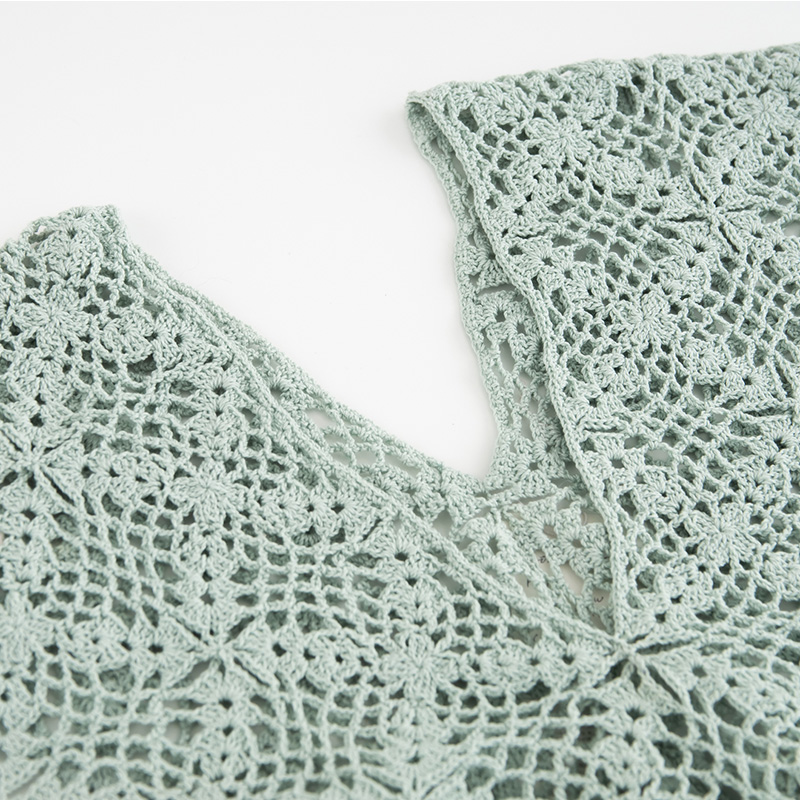 モチーフと模様編みを組み合わせたプルオーバー。全体に入った透かし編みが涼し気です。モチーフをつなぎながら編み、身頃下の模様編みを往復編みで編みます。