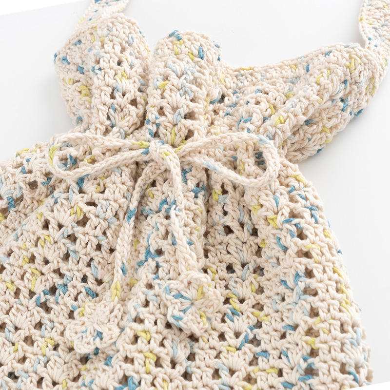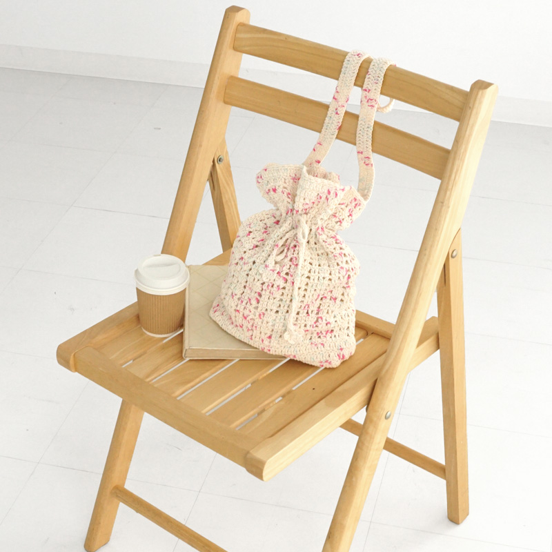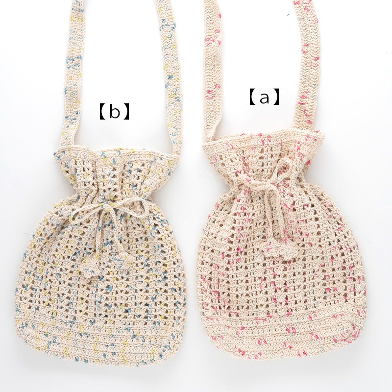 透かし編みが涼やかな巾着バッグです。持ち手を長めにしているので肩にも掛けられます。ひもの端にお花のモチーフを付けて可愛く仕上げました。