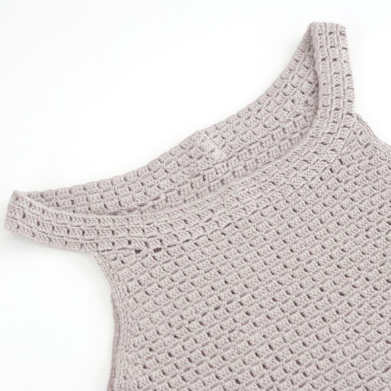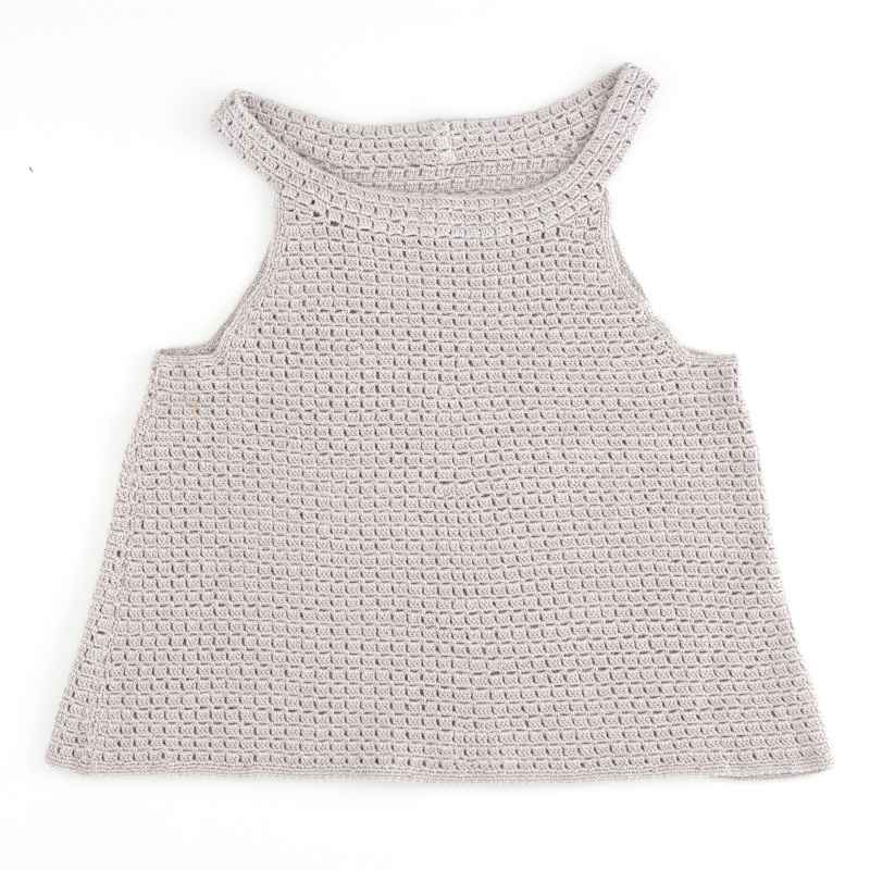 シルクカシミヤ「クシェル」で編む繊細な春夏のシンプルなタンクトップです。裾に向かって少し広がっているデザインです♪身頃はヨークから目を拾い、模様編みで編みます。