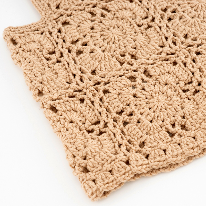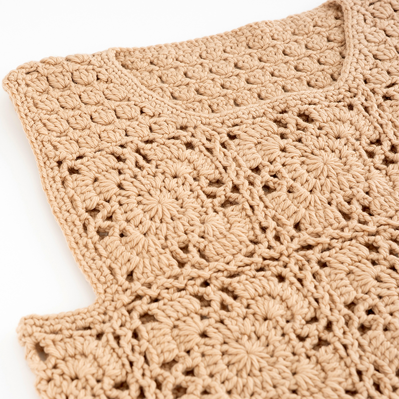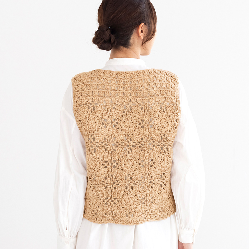 ちょっと懐かしい雰囲気のベストです。四角モチーフを編み、2枚目以降は最終段で編み繋ぎます。