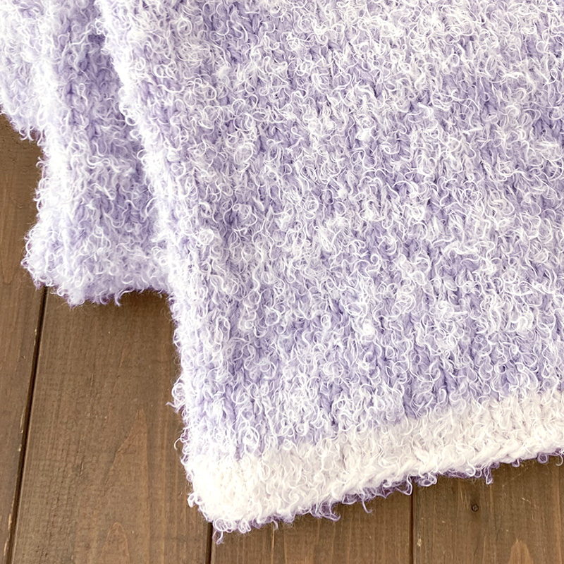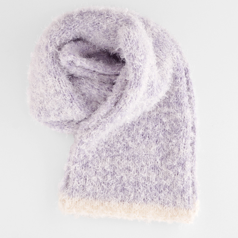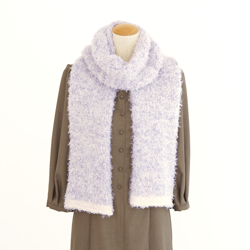 繊細な印象のメリヤス編みのマフラーは、エアウールとくるリモアの2本どりで編みます。棒針編み初心者さんにも安心の編み方手順とTikTok動画の二次元コードつき。