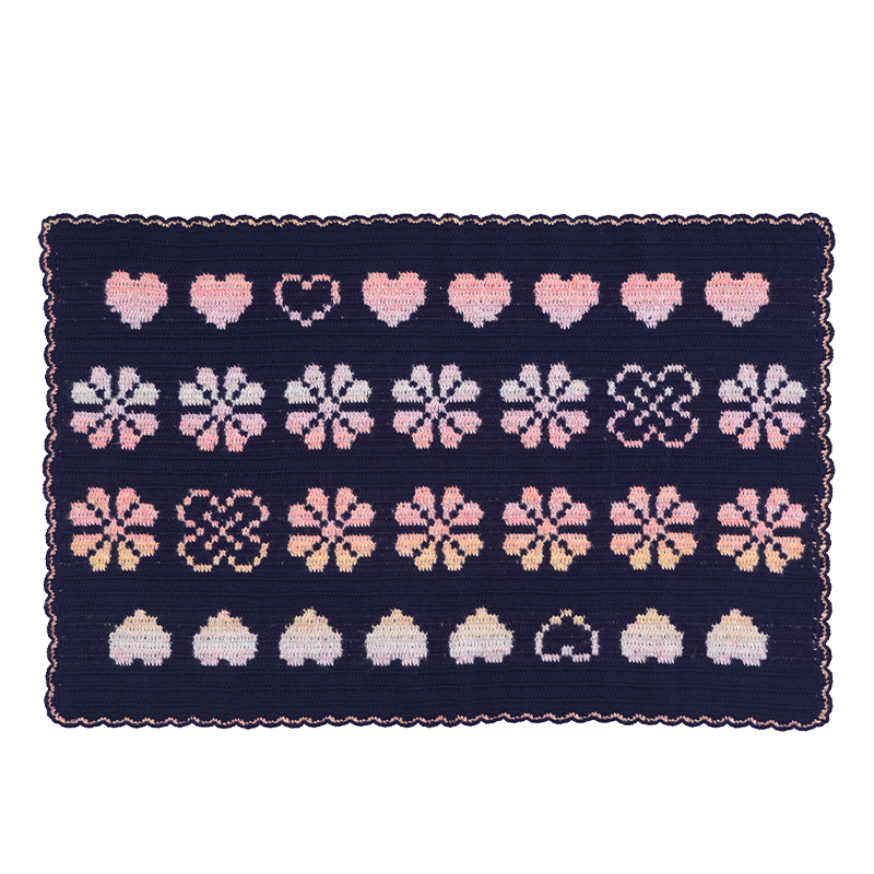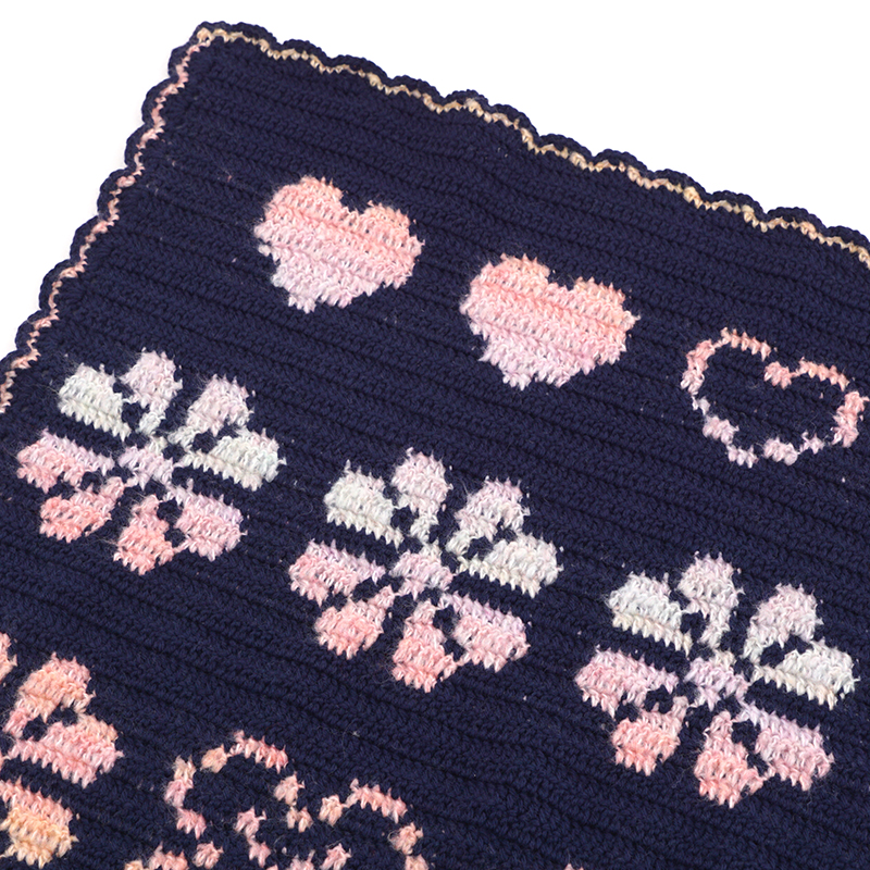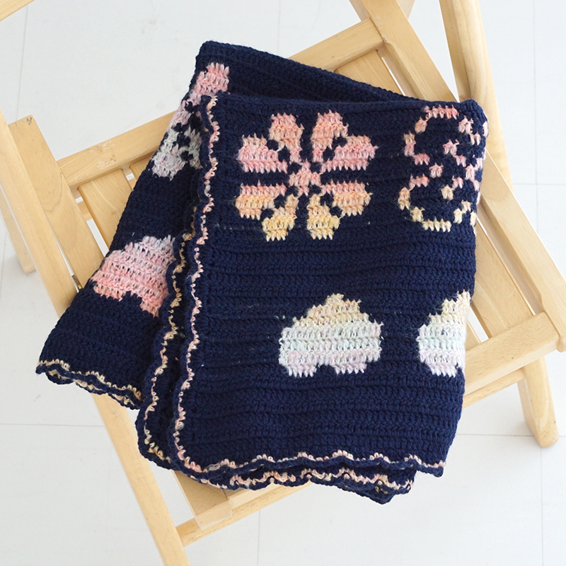 模様部分をグラデーション糸で編んだブランケットです。地色がネイビーなのでグラデーションが映えます。模様がずれないように目数に気を付けてください。