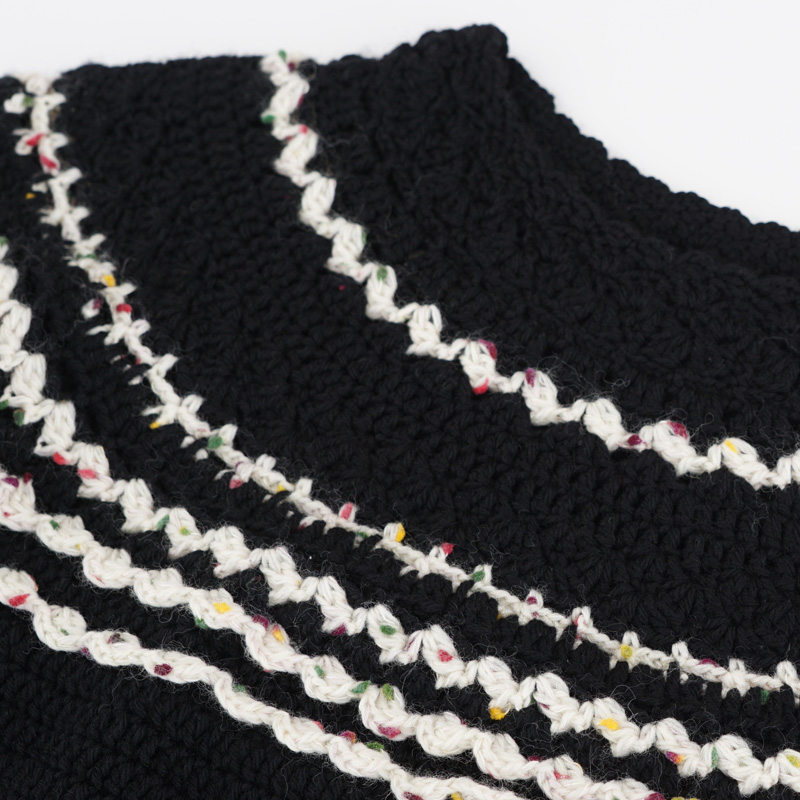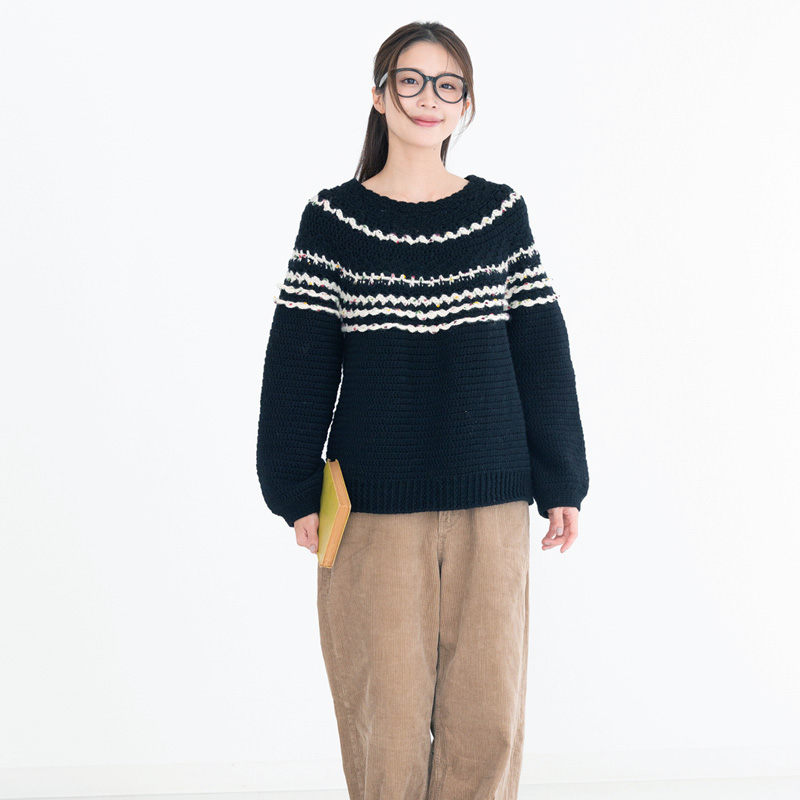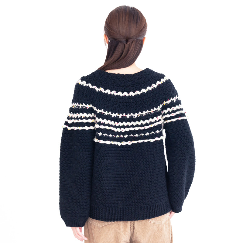 ネックから編む丸ヨークのセーターです。黒をベースにカラフルなポンポン付きの糸をアクセントにしました。フロントとバックで少しデザインが異なります。着丈、ゆき丈は長編みで調節できるのでお好みの丈で編んでみてください。