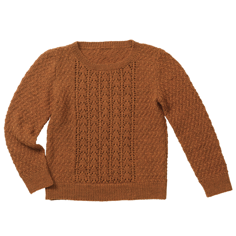 着回し力バツグン!前身頃の中心に透かし模様を配置したセーターは、テラコッタカラーで今年顔に。インナー選びでカジュアルにも上品にも着られ、お洒落の幅が広がるアイテムです。伸縮性のある糸なので、伸ばしすぎないように注意して編みましょう。(ニットアンジェ2019-2020年秋冬号)