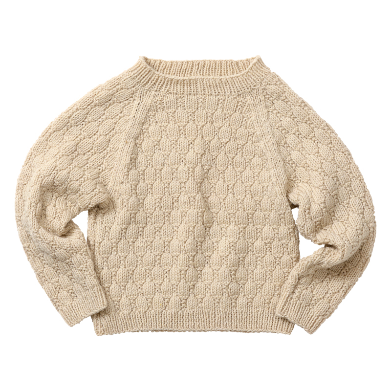 ドルマン風の袖でゆったり着られるセーターは、休日の公園遊びにもぴったりの動きやすさ。メンズとキッズは同じ模様の色違いです。ラグラン線は出来上がりが表目4目並ぶように編みます。