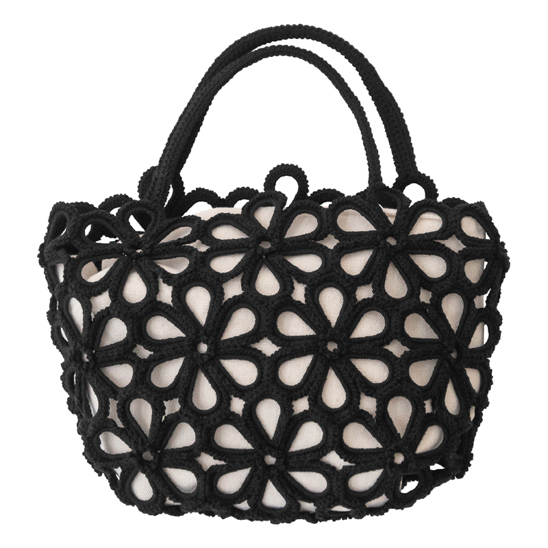 お花のモチーフが可愛らしいバッグは、中に入れる巾着のカラーで色んなパターンを楽しめるデザインに。細めの持ち手で華奢見え!女の子らしさに磨きをかけて。ニットリングを使っているので、しっかりした仕上がりになります。編みくるむ際、編み目が緩くならない様に糸を引き締めながら編むのがポイントです。