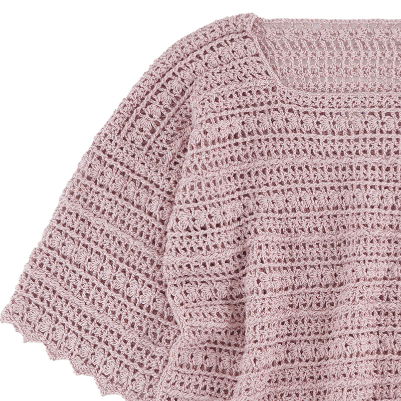 ぷかっとしたフォルムと裾のギザギザカットが魅力的なプルオーバーは、編み地の向きを横にしたデザイン。上品で繊細な透かし模様なので、女性らしいレイヤードスタイルが楽しめそう。カギ針編みの模様は難しくないので、ウエア作り初挑戦の方にもおすすめのアイテムです♪