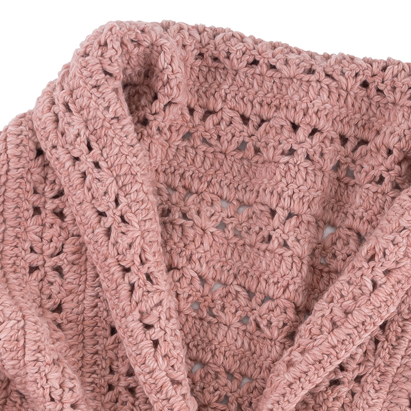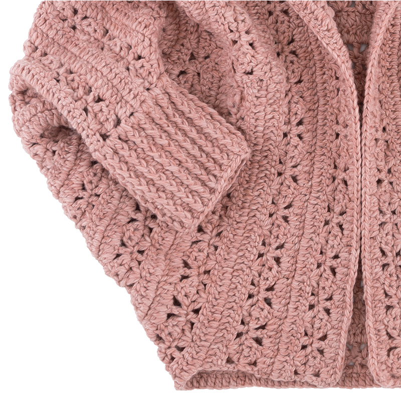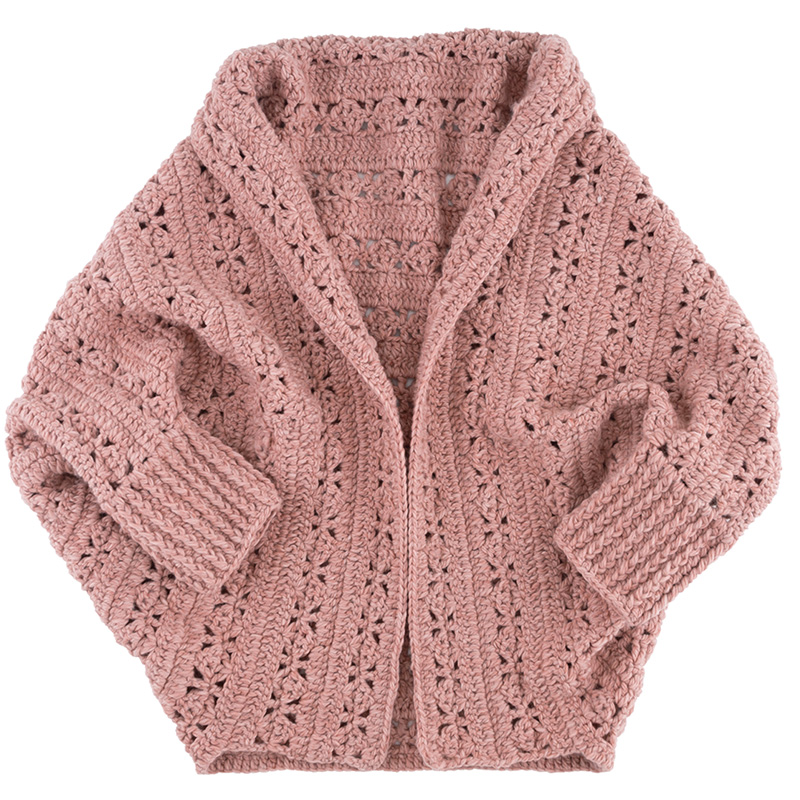 さっと羽織れる気軽さとゆるっとしたニュアンスが可愛いドルマンカーデ。ウールの極太糸をカギ針で編んでいるので、程よく厚みがあり暖かいです。真っ直ぐ編み進めるので、ウェアを編んだことのない方にも挑戦しやすいアイテムです。