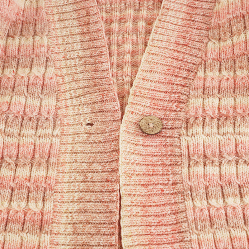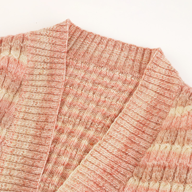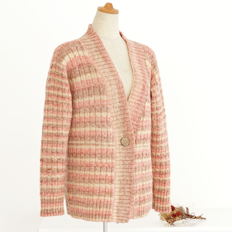 くつろぎのおうち時間にも。リラクシーで親しみやすい雰囲気のウォームカラーのカーディガン。お出かけ着としてはもちろん、くつろぎのお家時間にも使えるアイテム。模様編みの交差は、縄編み針を2本使用して編みます。