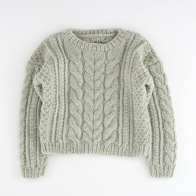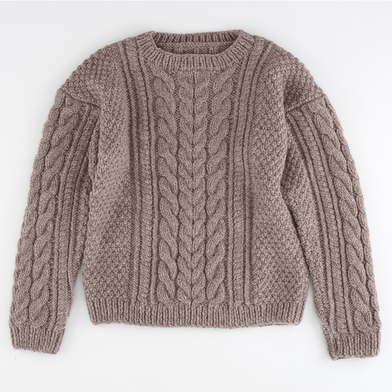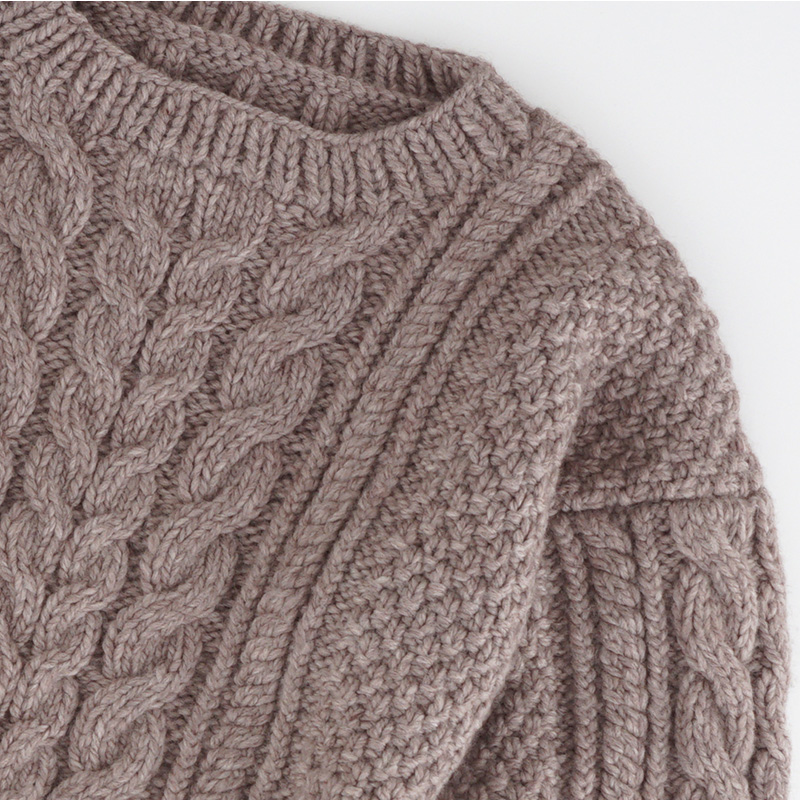 定番秋冬ニットのアラン模様のセーター。手の込んだ模様編みで、大切な人に着てほしい愛情いっぱいのおそろアイテムです。脇と袖下にかのこ編みを配置し、前後と袖中心にケーブル編みを入れて編みます。