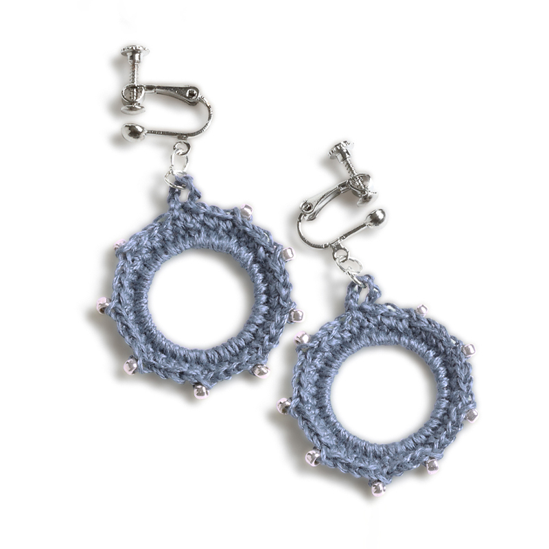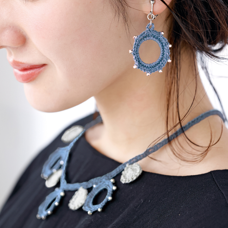 エイジレスの可愛さ。春夏の装いに合わせやすい落ち着いた色合いのネックレスとイヤリング。シルバーのビーズを入れることで、きれいめお出かけコーデにもぴったりです。ビーズは編む前にすべて糸に通しておきます。ひも部分を編んでからパーツを結びますので、お好みに合わせて位置を変えられます。