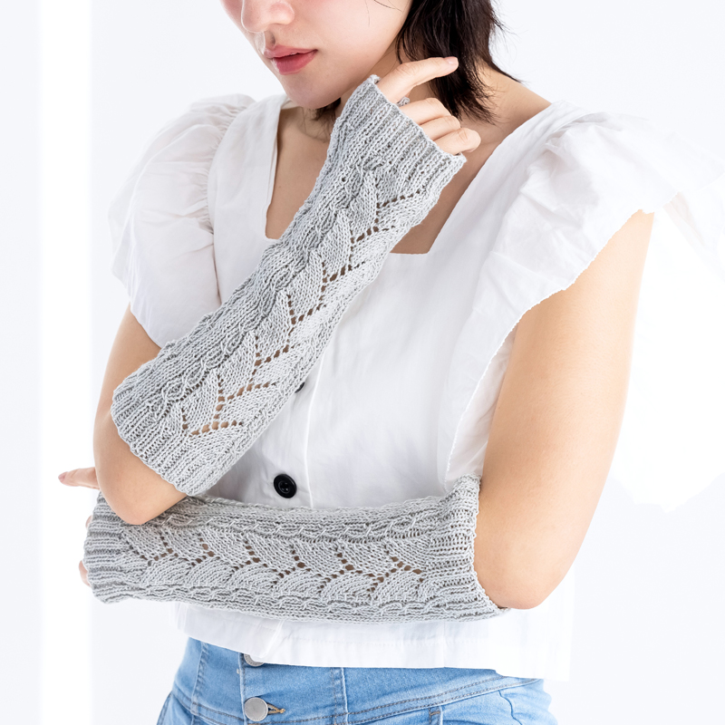 柔らかな肌触りが気持ちい、透かし編みのアームウォーマー。いろいろな色を揃えて、スタイリングを楽しむのがおすすめ♪目数は編み始めから終わりまで変わりませんが、途中で針の号数を替えることでゲージ調整を行います。