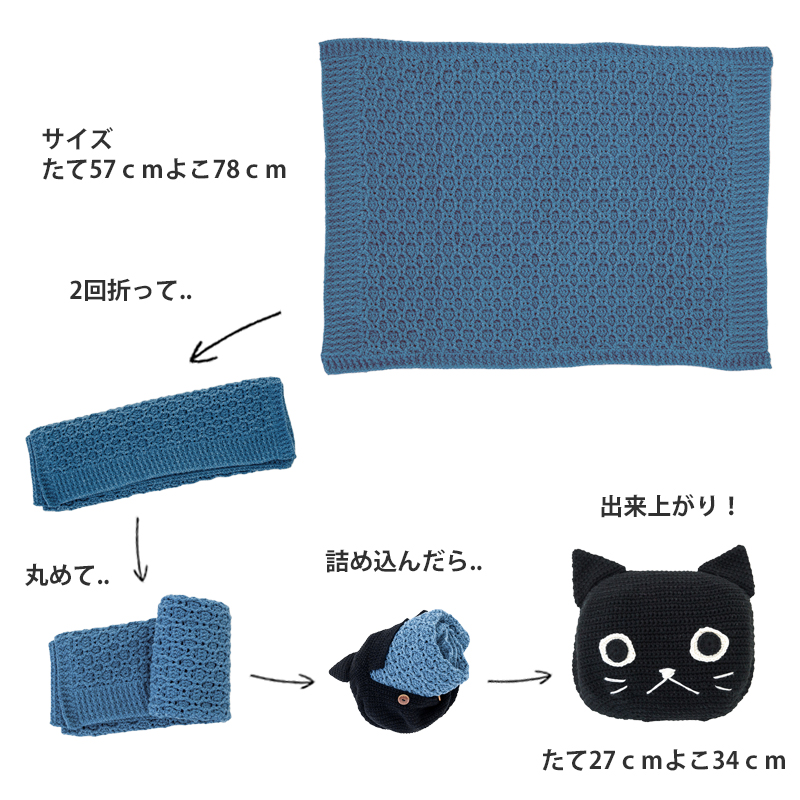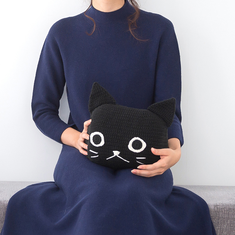 【編み図を新しくリニューアル!】ハニカム模様のミニブランケットと、使わないときに収納できる黒ネコのケース。もちっとし柔らかな質感だから、ネコ型クッションとしても使用できるリラックスタイムに欠かせないお供♪