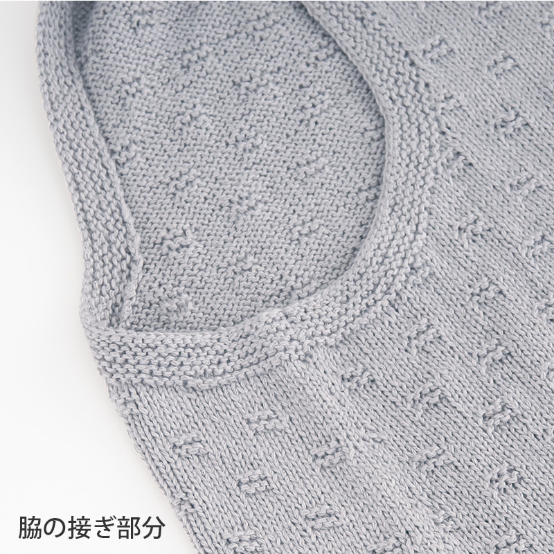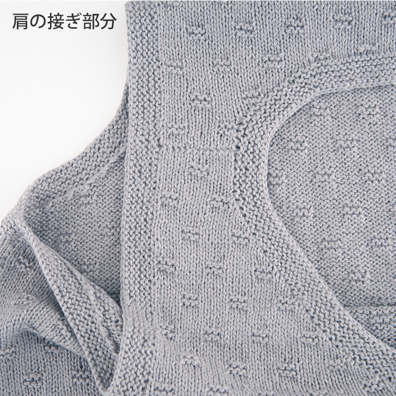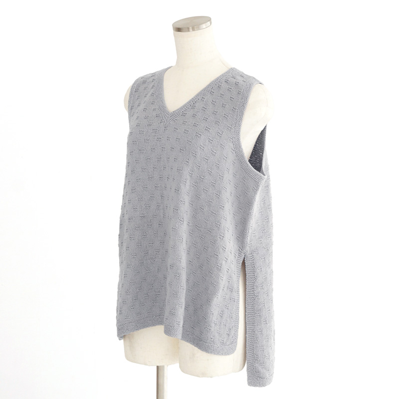 前後の裾に差をつけたロングベスト。ちょっと広がったAラインでスッキリと動きやすく。裾と袖ぐりにガーター編みを。本体は簡単な地模様です。