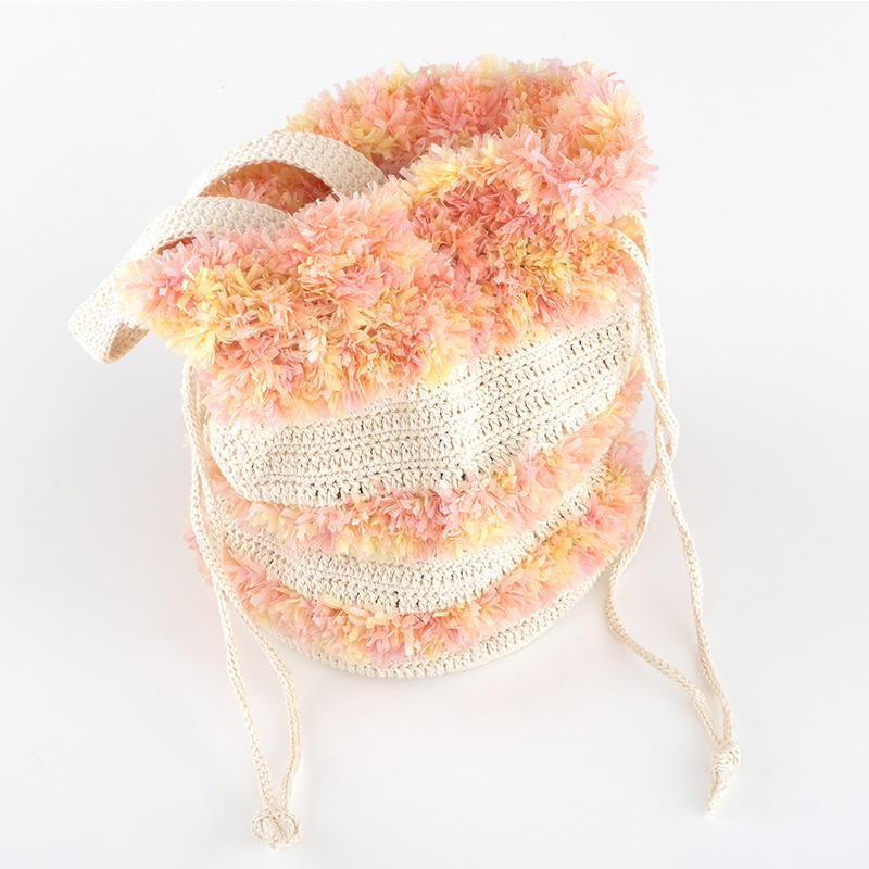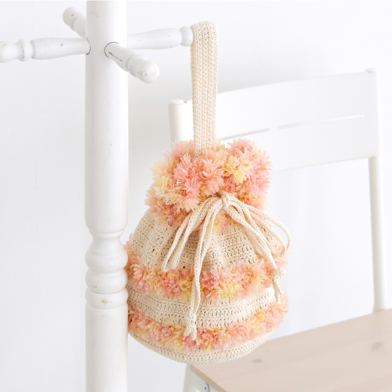 ひもを引き締めると花束みたいで可愛い♪「ベーシックコットン」に「フラワーチュチュ」を合わせた巾着バッグです。手に提げたり肩掛けにしたりと2wayで使えます。