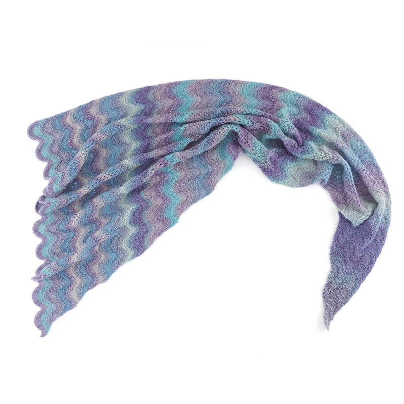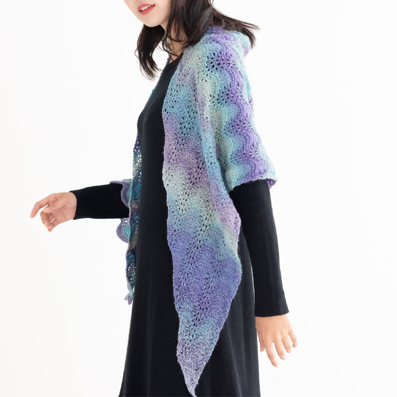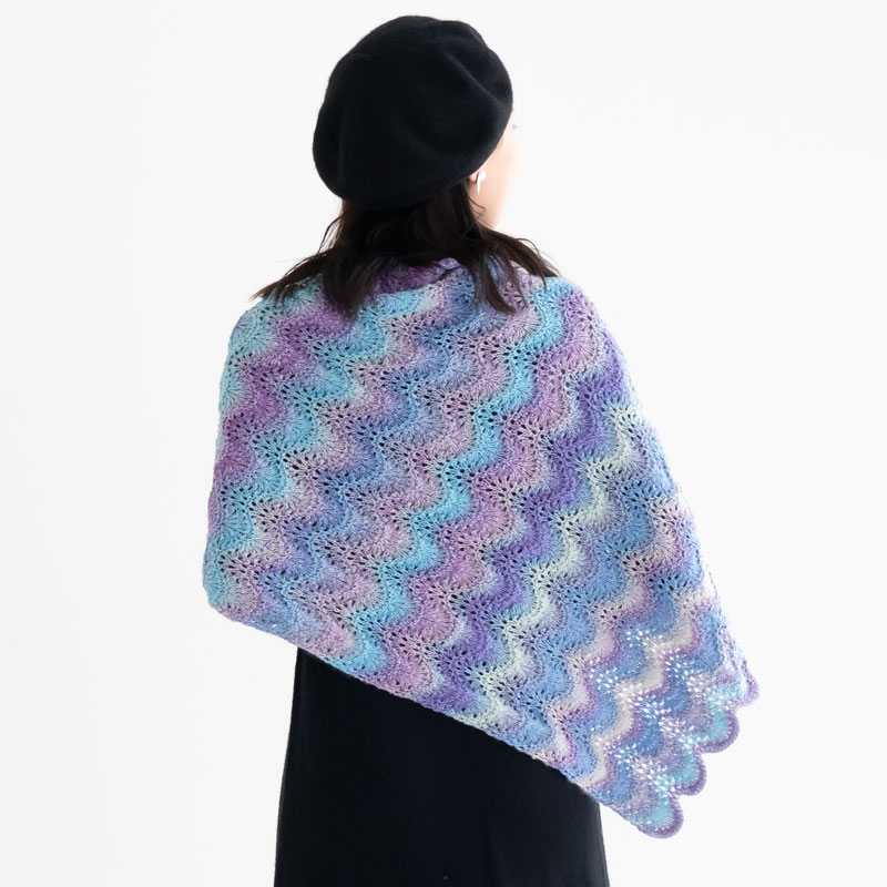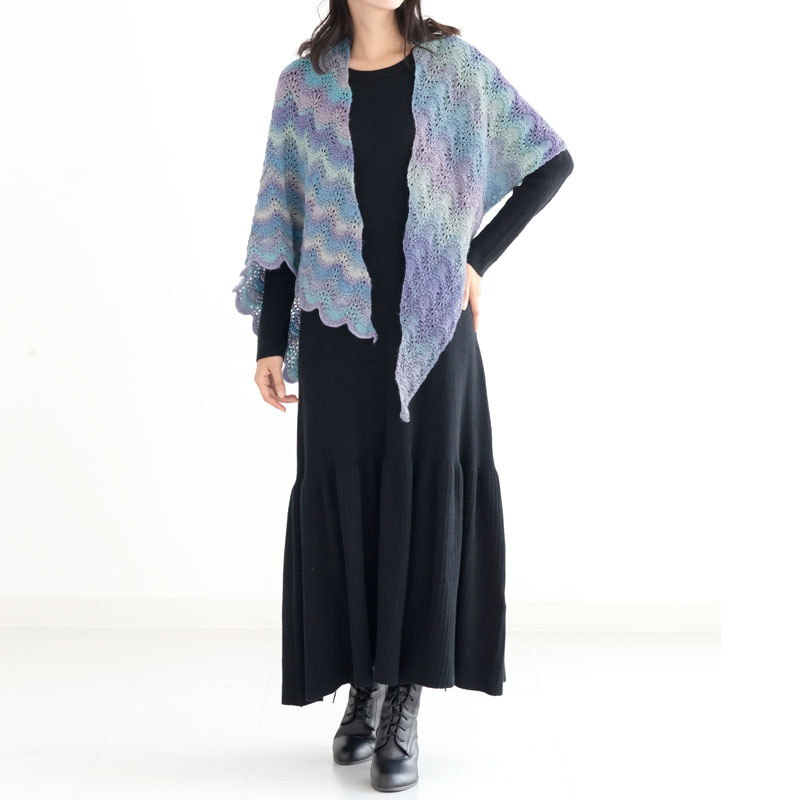 波柄と透かし模様を組み合わせた「ショール」。”ユウヤケ”のグラデーションを存分に楽しみながら編むことが出来ます。右側だけで減目していくので比較的簡単です。掛け目と2目一度、3目一度の数を間違えないよう気を付けましょう。共鎖はきつくならないように棒針の号数より3号程度上げてください。