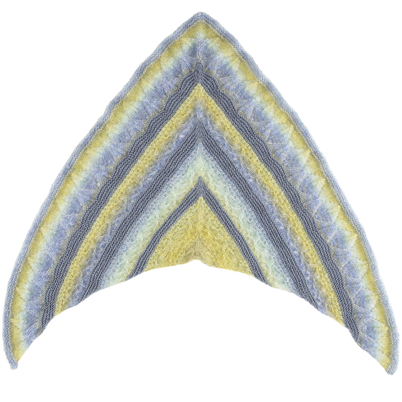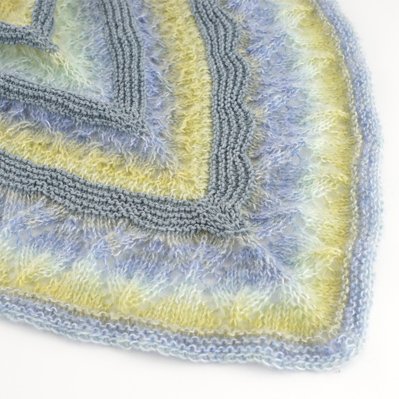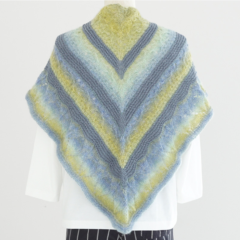グラデーションが印象的な透かし模様の「ショール」は、とっても軽くて柔らか。単色コットンウール糸と組み合わせた軽やかなボーダー柄は春先まで使えそう。