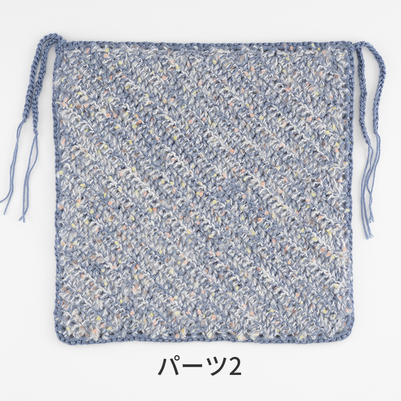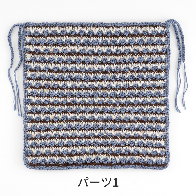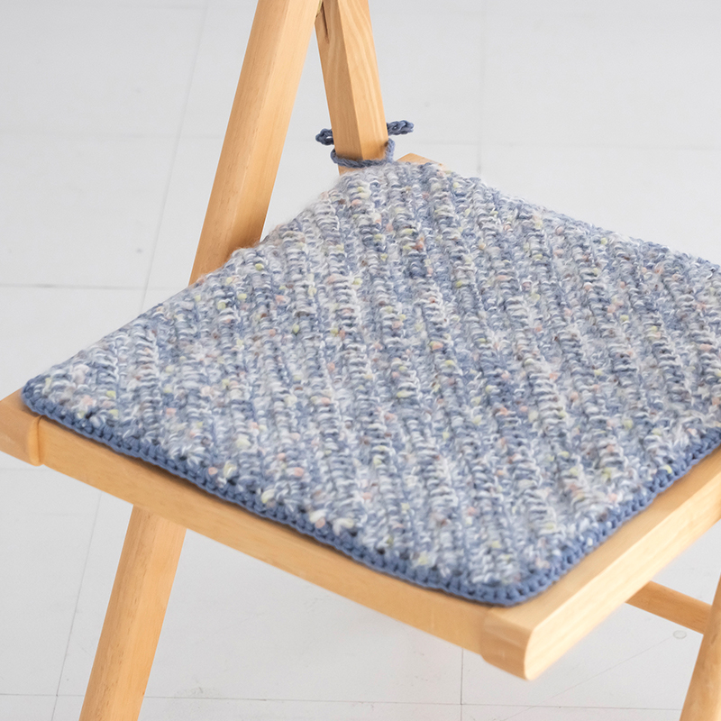 ふわふわ素材とウールを組み合わせて編んだ角座です。柄違いの編み地を2枚合わせにして程よい厚みに仕上げました。片面は3色の模様編み縞、もう片面は異素材を2本どりした長編みの斜め編み模様です。