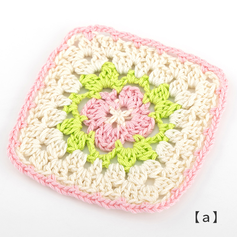 中心にお花を入れた3色使いの四角モチーフ♪ 1枚でコースターや花瓶敷きに。たくさん編み繋いでランチョンマットやテーブルクロスにも良さそう。