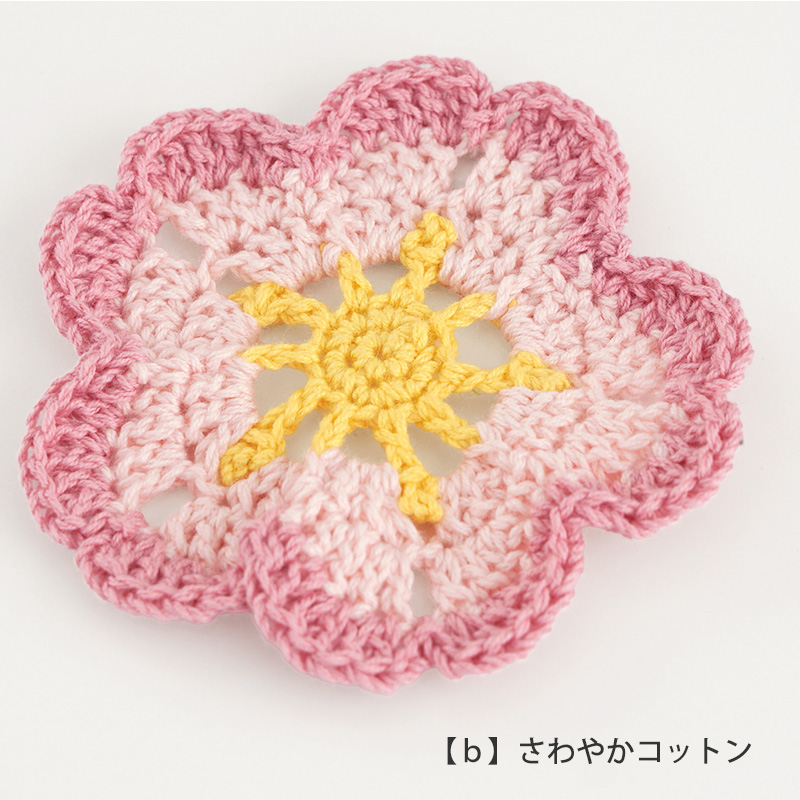 春にぴったり♪5角形をベースにした桜の形のモチーフです。1つだけでチャームにしたり、編み繋いでガーランド風にして飾っても素敵です。