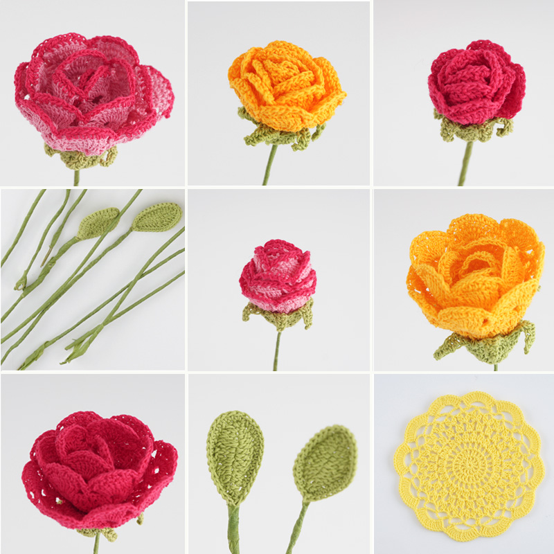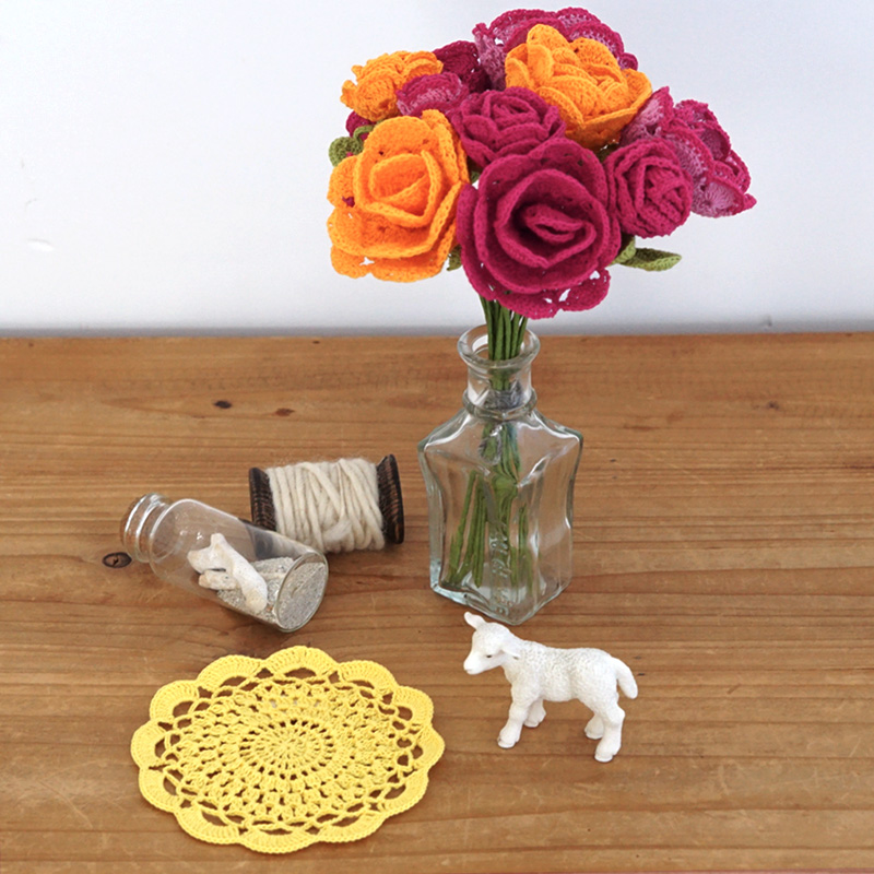 たくさん編んで花束のように仕立てても、お花やドイリーを組み合わせてコサージュにしても、晴れの日をそっと彩る素敵なアクセサリーになります。極細のレース糸は少し手間がかかるけれど、ひと目ひと目を編む時間が楽しくなる。ずっと大切にしたくなる作品が仕上がります。