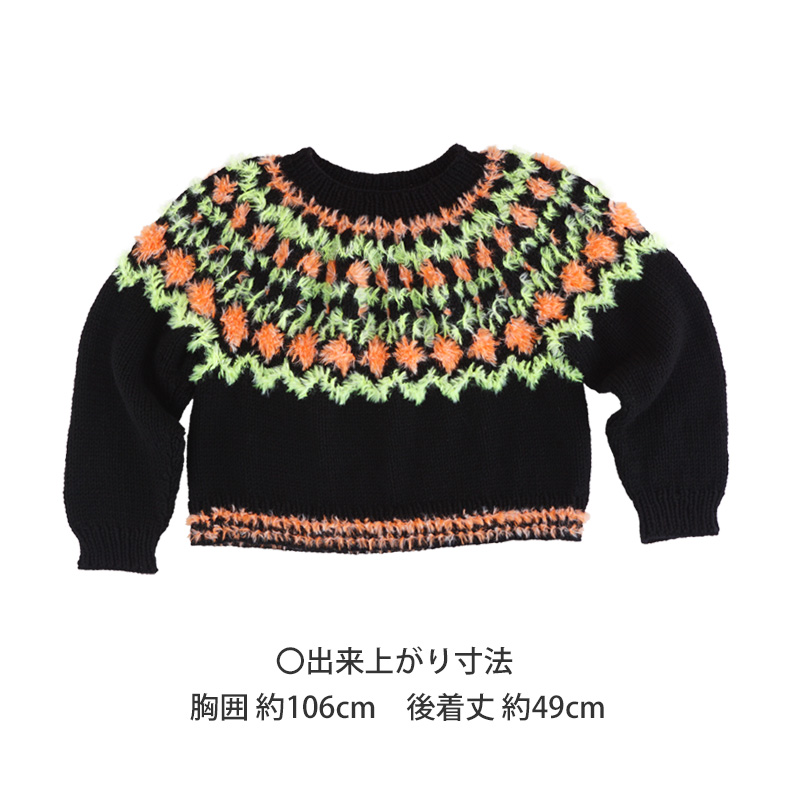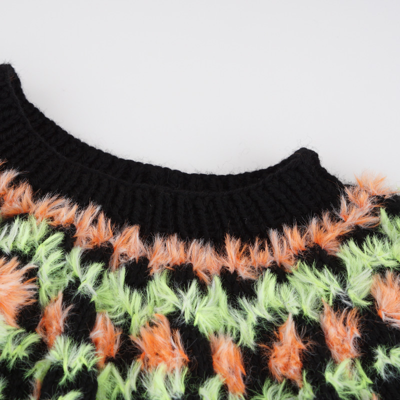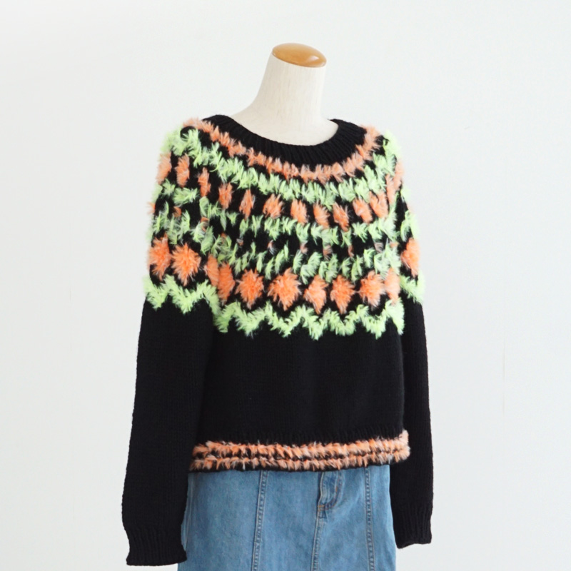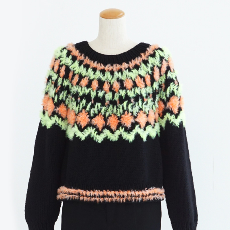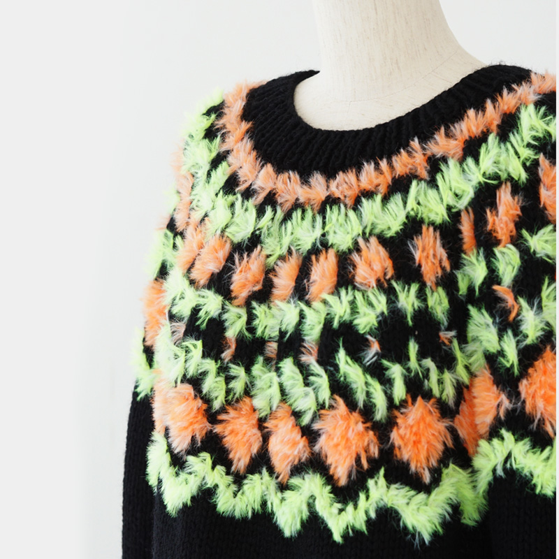 モケモケとした質感の蛍光色毛糸を黒ベースに編み込んだ、印象的なセーターが完成しました。模様部分は蛍光色と白糸の2本取りで編むことで、柔らかく優しい色合いに。シンプルな黒パンツと合わせれば、モードな雰囲気に仕上がり、デニムとのコーディネートではカジュアルながらも洗練されたオシャレ感が際立ちます。個性的でありながら着回し力も抜群の一枚です。