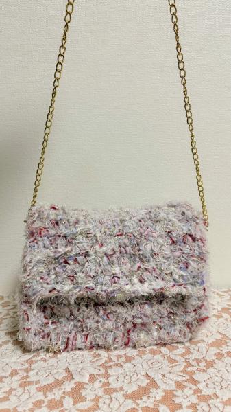 毛糸を8本引き揃えて作ったバッグです。往復編みで1面ずつ編んだ後に、引き抜き編みで組み立てているので、意外と簡単にできあがります。