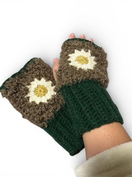 デイジーをワンポイントに、バイカラーのハンドウォーマーに仕上げました。