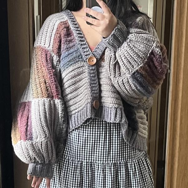 あこがれグラデーションが大好きで、この色味を活かしつつパッチワークのようなカーディガンが編みたくて制作しました。