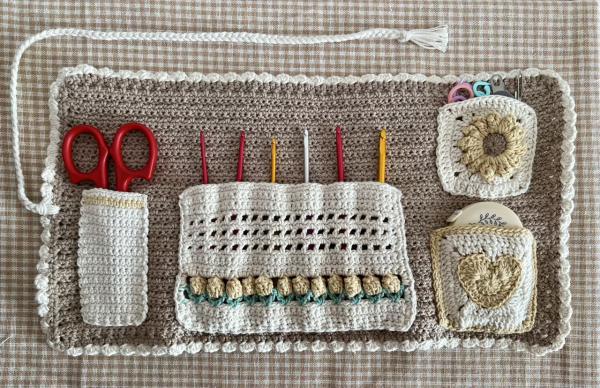 "編み物"に欠かせないかぎ針やはさみ、とじ針等を可愛く収納したいと思い、こちらの作品を編みました。外側はアルパインステッチという技法を用いて上品な見た目にし、内側は黄色のチューリップにかぎ針、ハートモチーフにメジャー、お花モチーフにとじ針やマーカーを収納できるようにして、とても可愛く仕上げることができました。かぎ針ケースを可愛いくしたことで、編み物へのモチベーションも上がり、毎日楽しく編み物をすることができているので、とてもお気に入りの作品です。