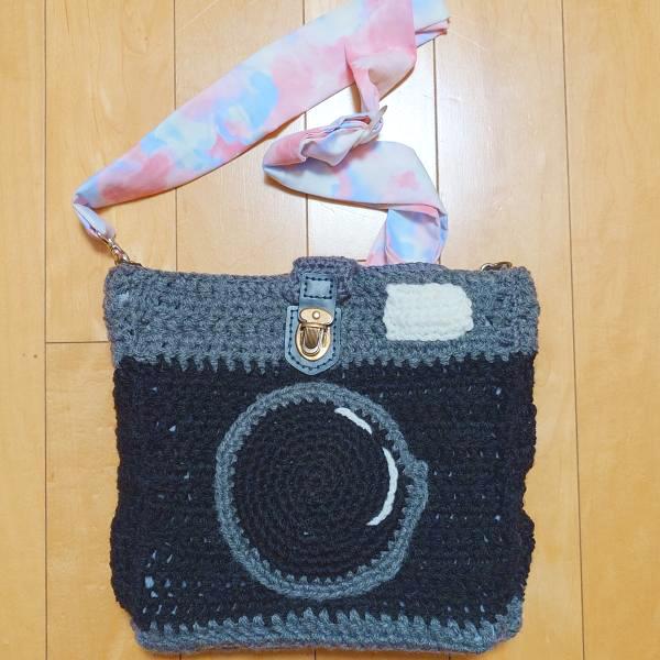 カメラモチーフのバッグは2つ目の制作です。レシピはオリジナルです。最初に作ったのはまだ編みもの始めたばかりの昨年初夏でしたがそれから毎日編みものをするようになり、前回はトートバッグでしたが、今回はショルダーバッグにし、思い通りのサイズに編むことができました。写真も趣味なので、写真のイベントに行く時に愛用します。
