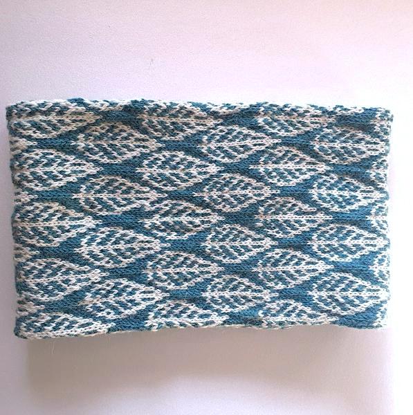 メリヤスで斜行してしまう手織りノートですが、編み込みすることで棒針編みに使うことができました。