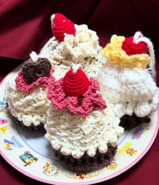 カップケーキの巾着を見かけてかわいいので、自分でもチャレンジしてみました。コードストッパーの部分をイチゴにしたり、ハートにしたり、クリームに見えるように編み方を変えてみたり、色々試してみました。