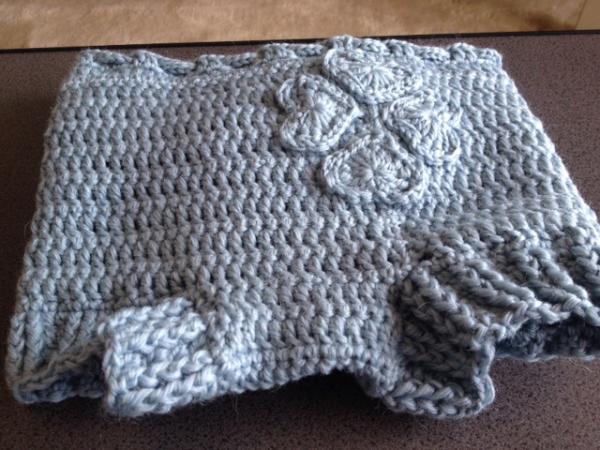 友人の子供にウールソーカーをかぎ針で編みました。ウール100%にこだわりたくて、ウエスト紐も編みました。ハートを4枚編んで四つ葉のクローバーを縫い付けました。糸は主人名義で購入してもらいました。