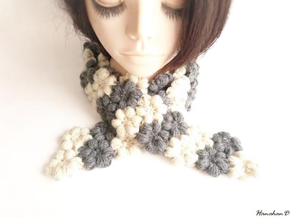 ぷくぷくとしたお花のモチーフをたくさん繋ぎながら編んだマフラーです。アルパカが入っているウールなので暖かく、ラリエットの様にかわいらしい雰囲気で使えます。機能性とファッション性の両方を重視しました。