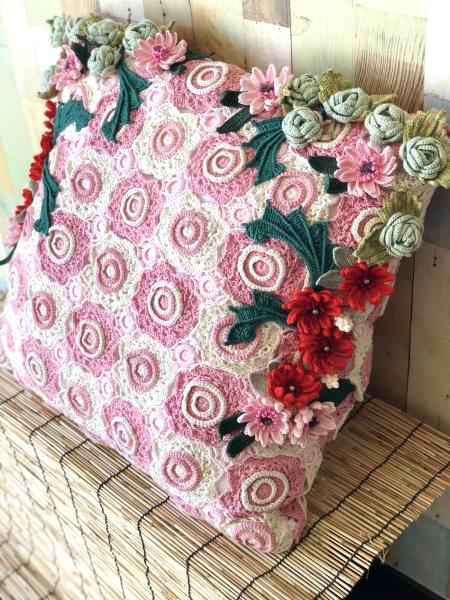 クッションカバーのベースは部分は100均一セリアにてNEWコットンベビーやNEWエンジェルコットンなどのピンクや白を使い細かなドイリーを一つずつ繋げて裏でボタンで留められる様に作りました。それだけでは寂しいのでトロピカルコットンなどを使いガーベラや薔薇を編み周りにつけました。ベースが全てコットンなので肌触りが良位仕上がりになりました。