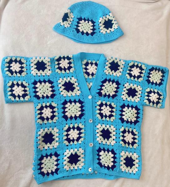 夏らしい色のグラニースクエアのカーディガンと子ども用の帽子です。ネイビーやホワイトの糸を合わせることで派手になりすぎず普段使いしやすいようにしました。