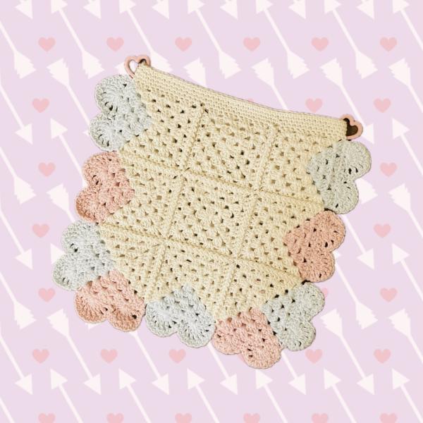 参考より少し小さめにしたハートのポシェットです。モチーフを編む際、色替えに苦戦しましたが楽しく編むことができました。繋げていくと色合いとハートが出来ていく感じが嬉しかったです。カラビナもハートにしたのもポイントです。