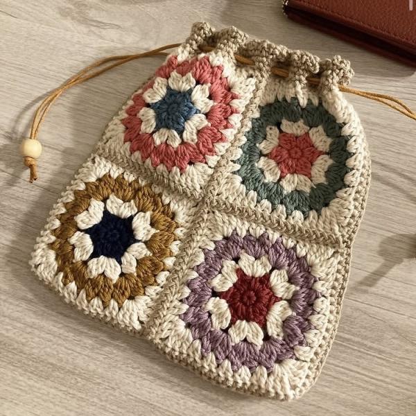 裏表すべてのモチーフを違う配色で編んでいます。ナチュラルな雰囲気が素敵な巾着に仕上げました。