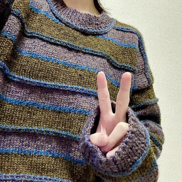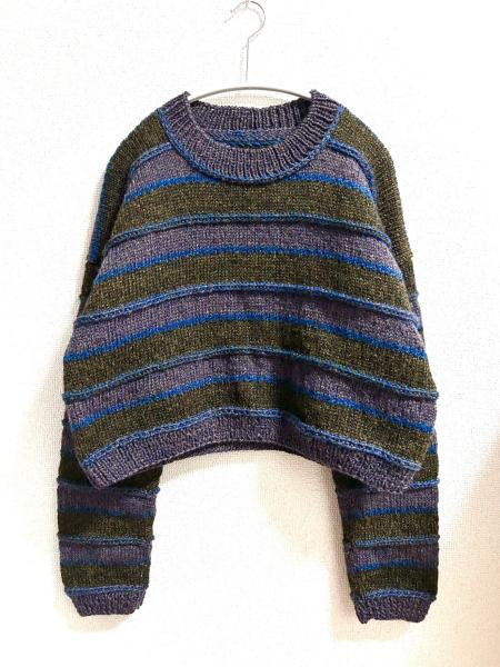 古着屋さんで販売されていそうな雰囲気のあるボーダーセーターを編みました。色の変わり目にひと工夫入れているのがポイントです。